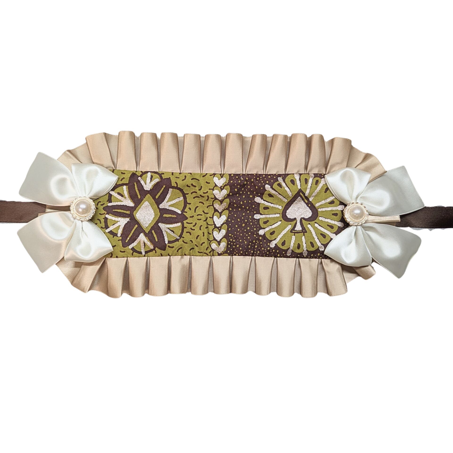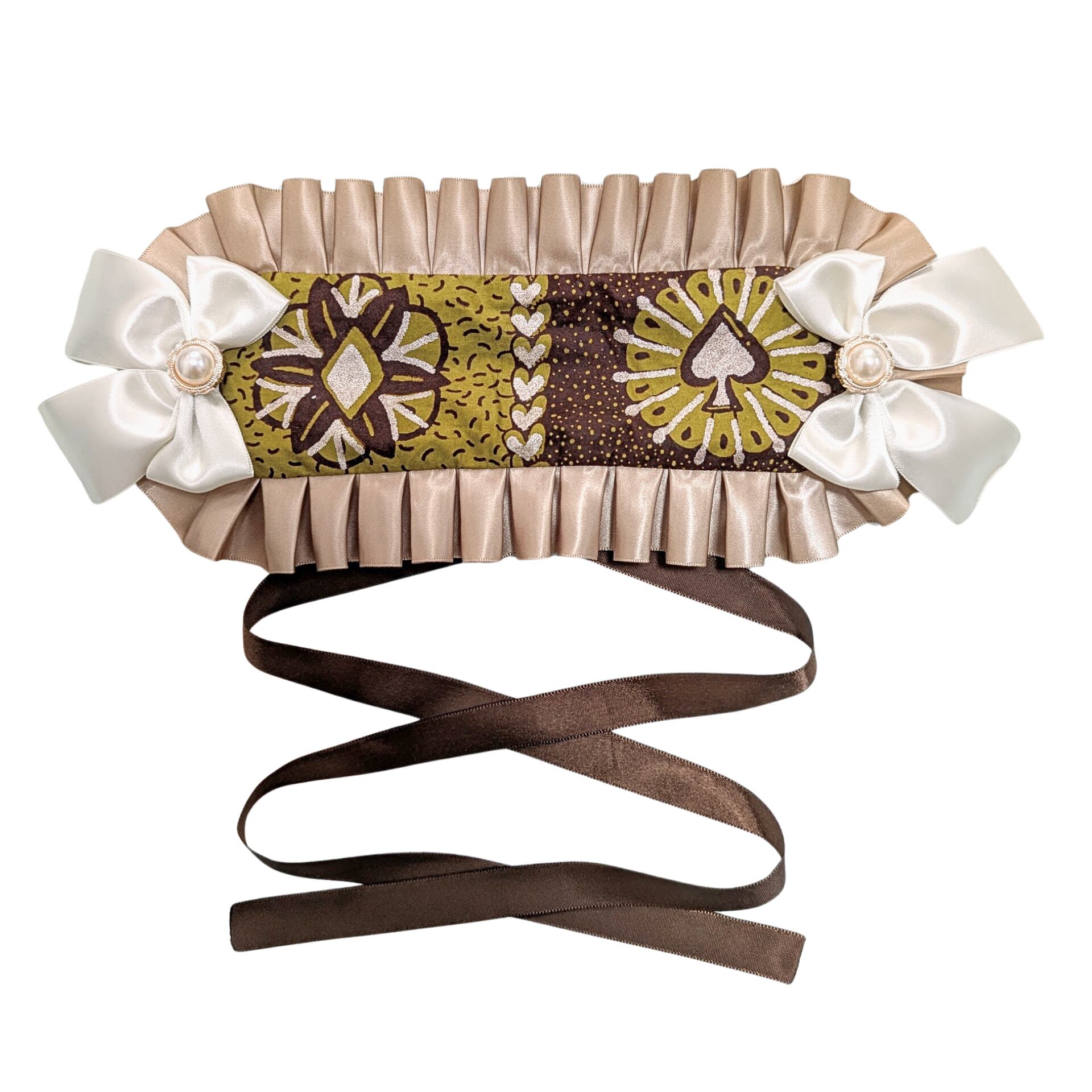 とろけるチョコレートブラウンに、高級アフリカ布の特徴であるローズゴールドのラメとトランプ柄のクッキーとたくさんのハート。