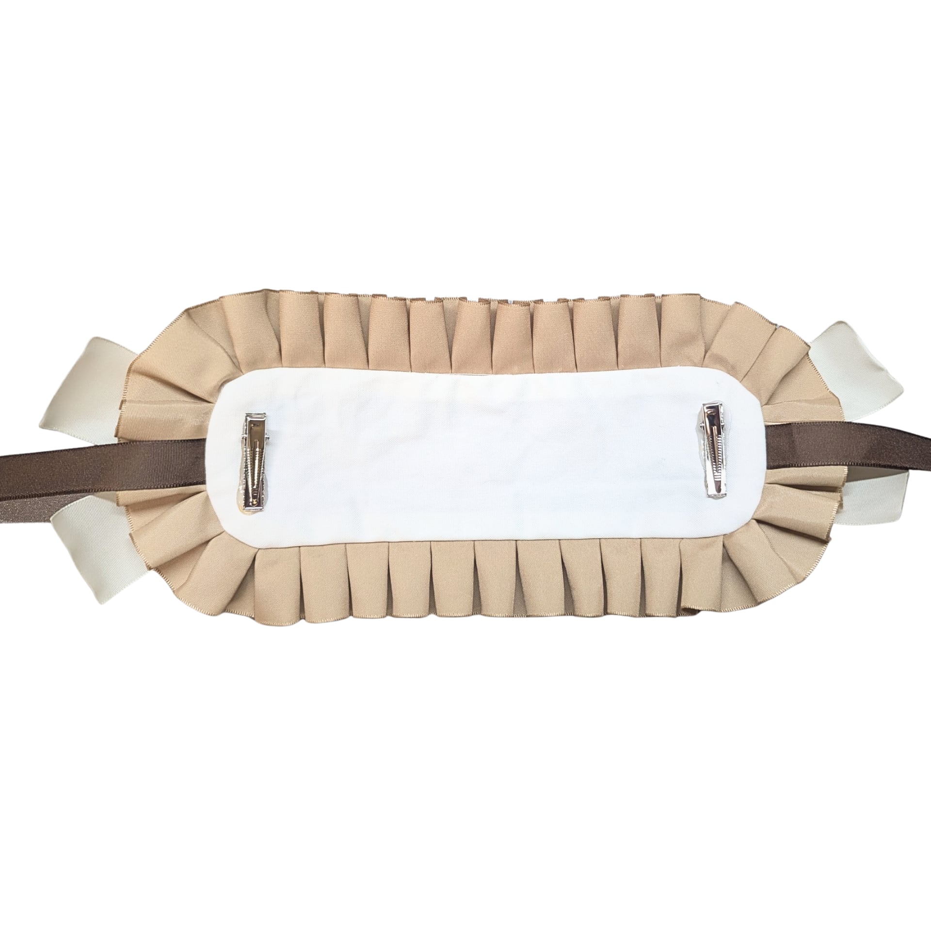 お揃いのヘッドドレスは、マロン色のサテンフリルとパールリボンを添えてトータルコーデが楽しめます。クリップで簡単に着用いただけます。