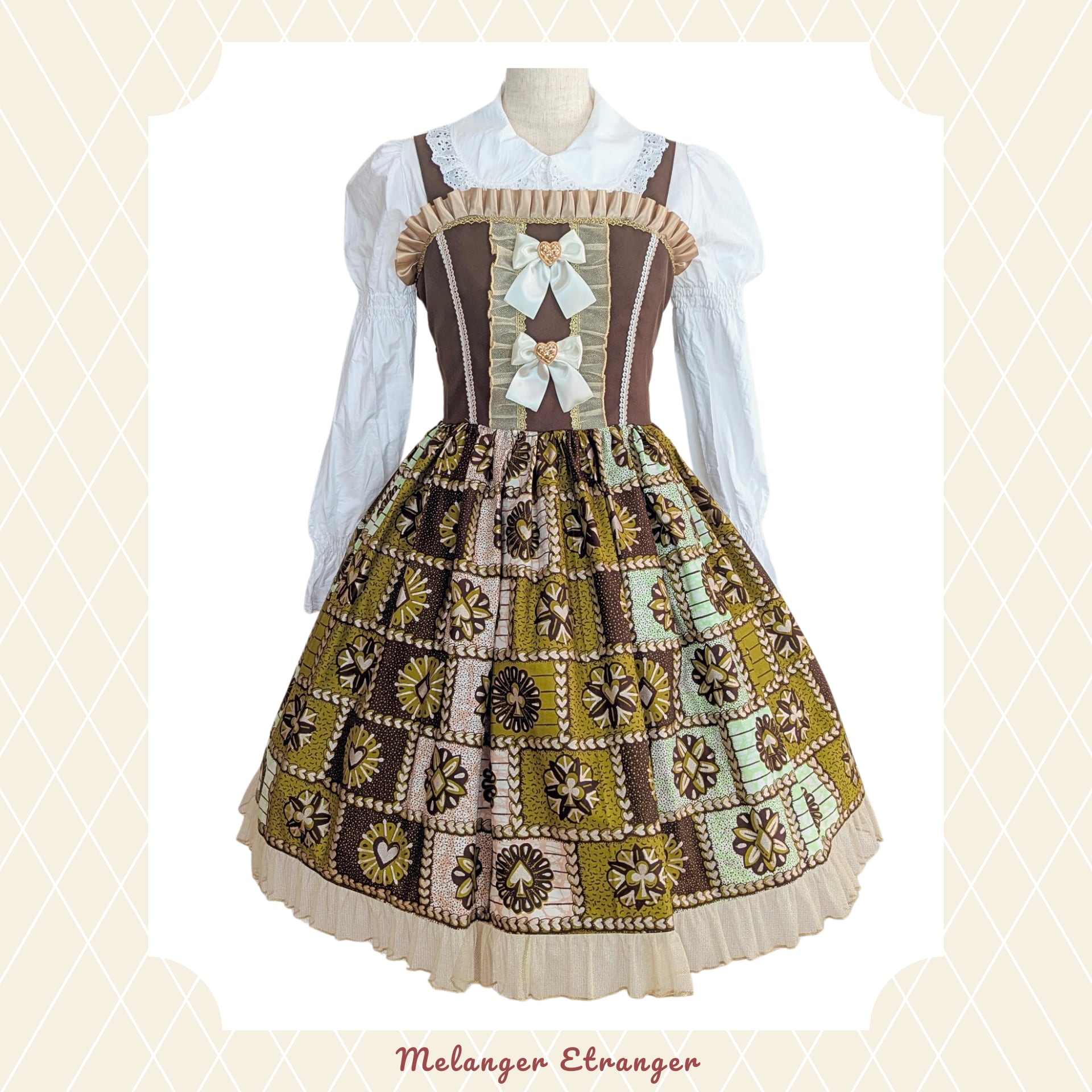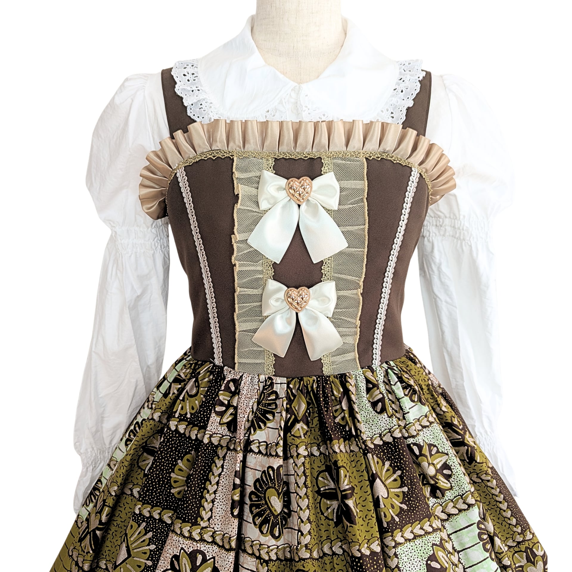 胸元にはマロン色のフリル、キラキラのゴールドレース、クリームのような白いサテンリボンと中央には「ぷっくりつやつやのハートボタン」をあしらいました。