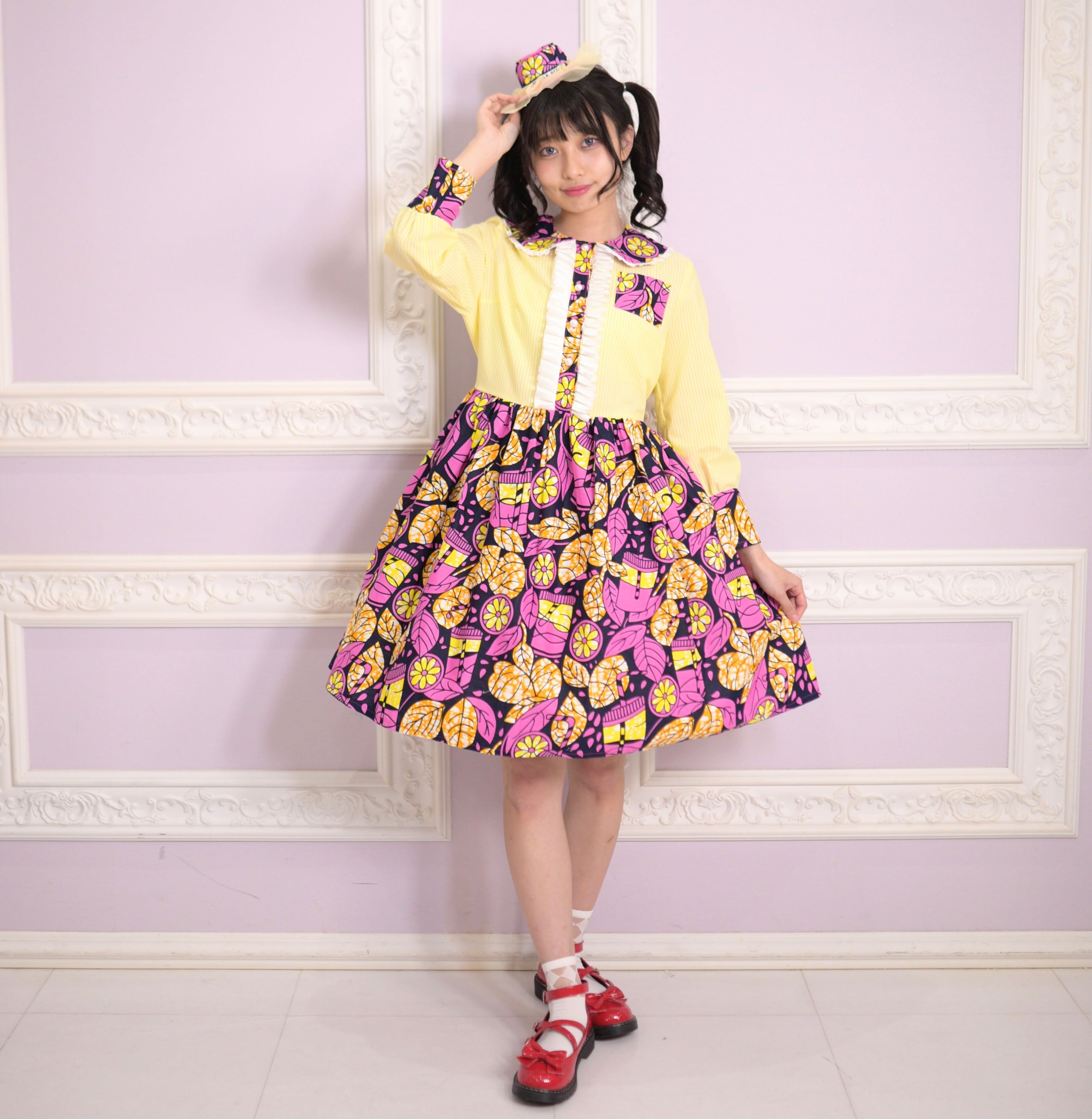 明るいピンクの葉っぱとレモンの柄がとってもキュートなアフリカ布とさわやかなレモン色のストラップ生地をダイナー風のワンピースにしました。