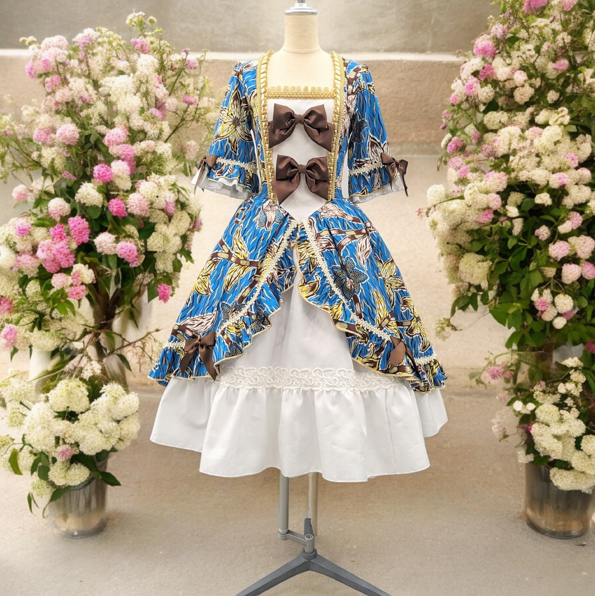 品のあるブルーとユリの花が華やかなローブ・ア・ラ・フランセーズワンピースです。